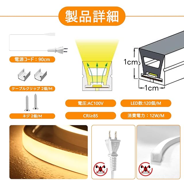 2024新開発 100v-LED ストリップライト. シリコン製10cmカット可能 LED ストリップライト、無臭、ワードローブ照明、配線不要、IP65 防水、線形発光、間接照明 DIY 装飾、切断可能、取り付けが簡単(3000K-電球色-10メートル+プラグ+部品) | つむぎ屋