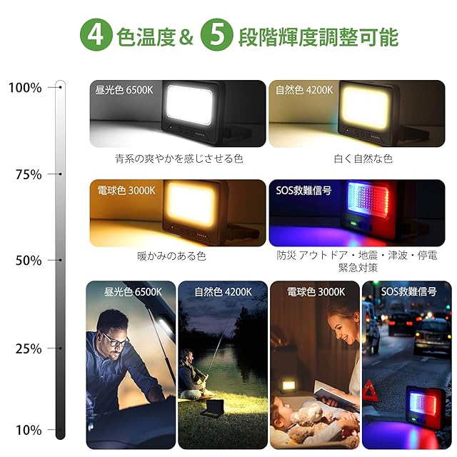 ▶✪【新登場の超高輝度LED投光器---昼光色/自然色/電球色/フラッシュモード4色切替&3段階調光】最新版の超高輝度LEDランタンは昼光色、自然色、電球色、SOS点灯(点滅)の4種類の色温度を切り替えします。SOS点灯モードは高機能なフラッシュライトではSOS救難信号モードを搭載しているものがあります。SOSモードで使用すれば延々とSOS点滅パターンを繰り返します。例えば緊急時など、誰でもいいから救助の要請を伝えたいという場合には、このSOSモードでライトを放置できるという利点は発見率を向上させるため、効果は計り知れないものがあります。また、明るさも3段階(HIGH100%-MID50%-LOW25%)光量調整可能で、光の強さを調整できで、場所や目的に合わせて使えます。HIGH-100%輝度-6000ルーメン、MID-50%輝度、LOW-25%輝度、最大光量で連続使用時間は約5時間、最小光量時の連続使用時間は30時間以上で、あまり光量が必要でない場面で光を抑えられれば、非常事態のときでも電池を長持ちさせられます。非常時でも安心して使えます。