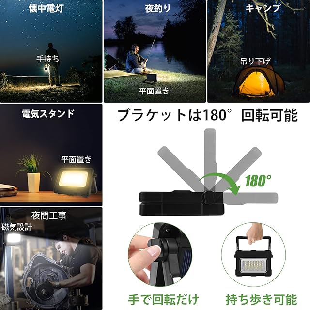 ★【180°角度調整可能スタンド・コンパクトで携帯便利・多種な使い方】投光器のスタンドは180度の角度調整が可能で、手ツマミですので、ツマミを手で少し緩めにしておけば作業しながら角度が変えれライトの発光面が結構細かいの微調整が利いて便利です。自分の使いやすい角度で自由に使えます。「吊り下げ」「置き」「手持ち」「三脚対応」「金属面に貼り付け」という多様な使い方で、場所を選ばない多目的使用することができます。