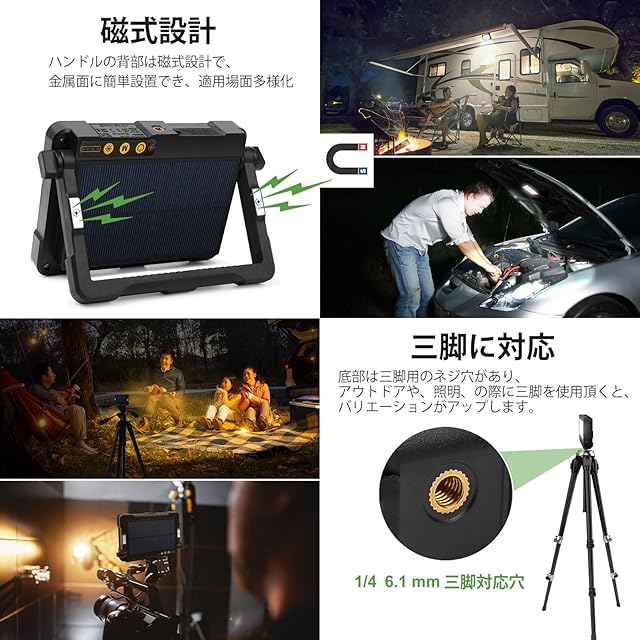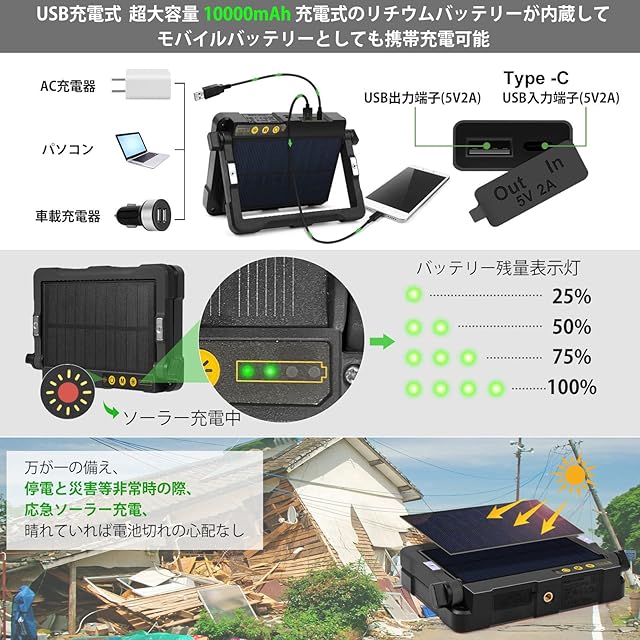 ★【大容量バッテリー20000mAh・便利なType-c充電式&緊急時のソーラー充電・モバイルバッテリー機能・電量残量表示】この充電式ライトは20000mAh大容量電池を搭載し、1A出力USB端子でパソコン、スマホなどが充電ができるUSBポートが付いています。応急電源として利用可能です。Type-c充電式なので、上下左右が対象な形のため、差し込む際に手間とりません、簡単かつ便利に充電できます。※タイプA to Cのケーブルを用いて充電してください。また、この作業灯の背面はソーラーパネルを配置して、災害時や非常時や停電時など、ソーラー充電対応でき、便利ですアウトドアであらゆる事態に十分対応できます。電量残量表示灯も付いており、ダイヤルで明るさの調節ができます。緑灯が点滅するとき、USBポートで充電中です。※バッテリー残量表示灯-25%(赤)-50%(緑)-75%(緑)-100%(緑)