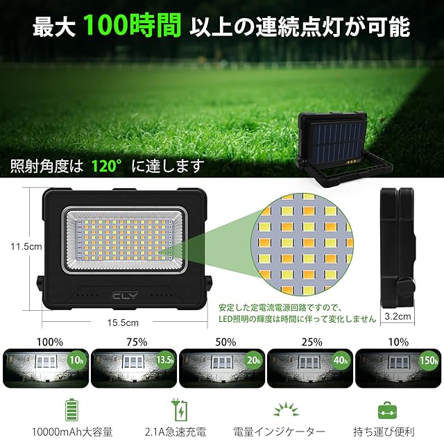 CLY LED 投光器 作業灯 ランタン 昼光色 自然色 電球色 SOS点灯 4色切替・5段階調光 高輝度 100W相当 USB充電式 10000mAh タイプC充電式 ソーラー充電 携帯型 懐中電灯 フラッドライト LEDライト キャンプライト 防塵・防水仕様 マグネット搭載 アウトドア 登山 夜釣り 緊急用/防災用品/停電時用/非常用/災害グッズ 応急 照明 日本語説明書 | つむぎ屋