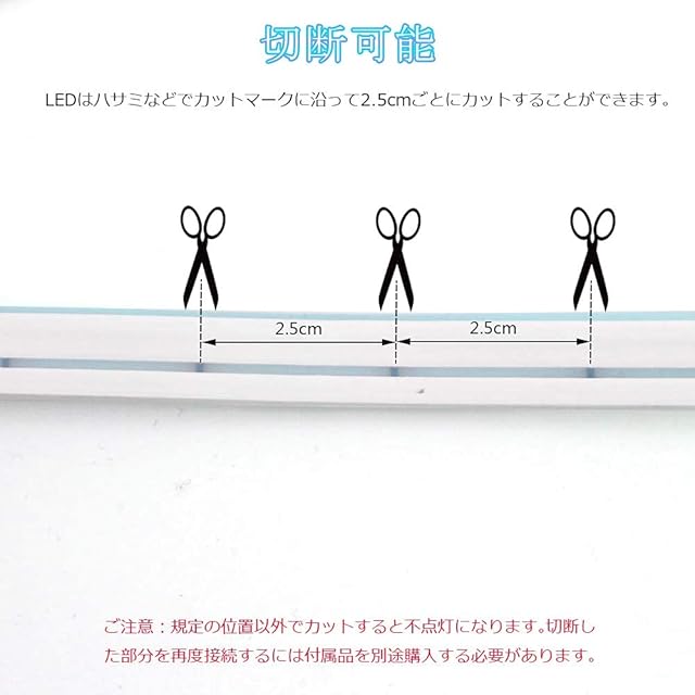 「商品特徴」電圧がDC12Vなので、手で触れても安全で、誰でもご安心して使用いただけます。ご商品は2.5cm間隔でカットできますが、規定の位置以外でカットすれば不点灯になります。「配線」赤線はプラス、白線はマイナスですが、点灯しない場合は赤線と白線を逆に接続して下さい。