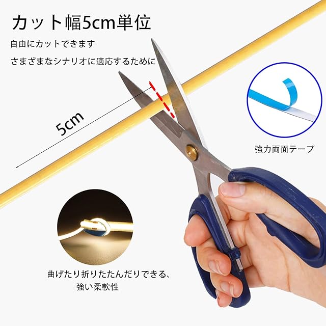 【便利で迅速なインストール】 LEDライトは裏側に両面テープが貼り付けられており、保護シールを剥がすことで様々な場所にLEDライトを貼り付けて使用することが可能です。LEDライトはハサミなどでカットすることが可能です。貼り付ける場所に合わせ長さを変えて使用することが出来ます。※カット幅は5cm単位