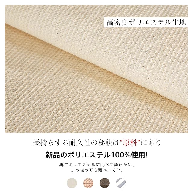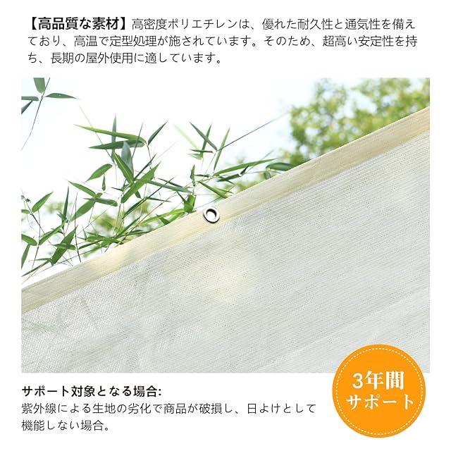 素材:耐久性に優れた高密度ポリエチレン使用。【3年間の品質サポート】:お買い上げの日から3年間、シェード生地のみに対するサポートとなります。紫外線放射による生地の劣化の為に商品が破れ、日よけとして機能を果たさない場合をサポート対象としています。