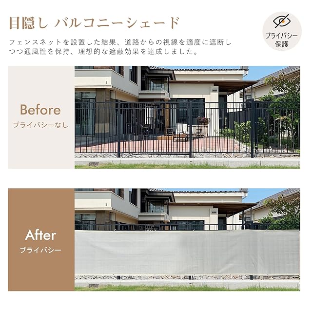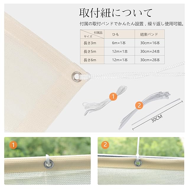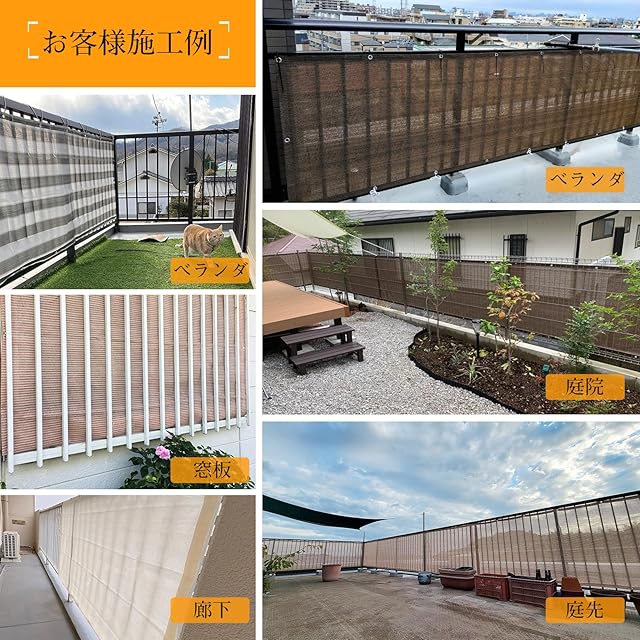 手軽に設置できる、ベランダの柵やお庭のフェンスなどにちょうどいいサイズで、長すぎる場合はハサミで簡単に切断して使うことができます。付属品:6mx1本取付けひも、リピートタイプ結束バンド 30cm*16本。