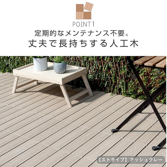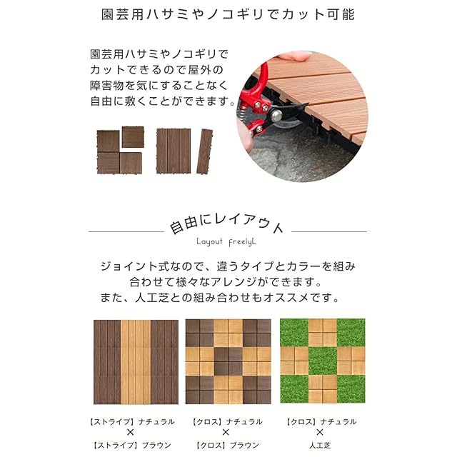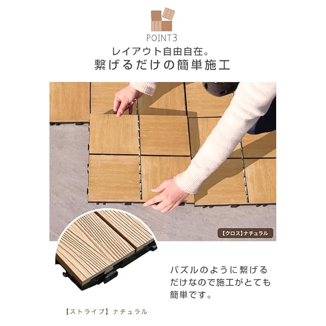 ※こちらは27枚セットです。【1枚あたりのサイズ】 ・本体部分の実質寸法: (約)29.5cm×29.5cm×厚さ約1.3cm ・ジョイント部分まで含めた全寸法: (約)30.5cm×30.5cm×厚さ約2.2cm【重量】【クロス】1枚あたり約0.7kg 【ストライプ】1枚あたり約1kg【耐荷重】1枚あたり約800kg【素材】土台:ポリプロピレン 天板:人工木<WPC(木粉45%入り)