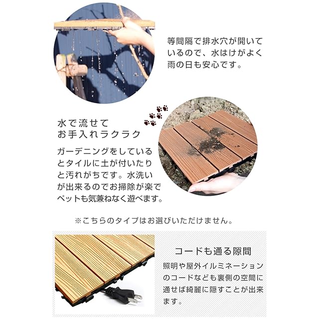【生産国】中国 【温度】耐熱温度:60℃ 耐寒温度:-20℃【備考】※2023年9月13日より【ストライプ】タイプの仕様を一新しました。※木の繊維方向により、パネルの向きで色味が異なって見える場合がございます。 ※製品特性上、土台部分の熱膨張によりタイルが浮く場合がございます。設置時場所の周囲に隙間を開けて施工するようにしてください。隙間は約3m毎に1cmが目安となります。