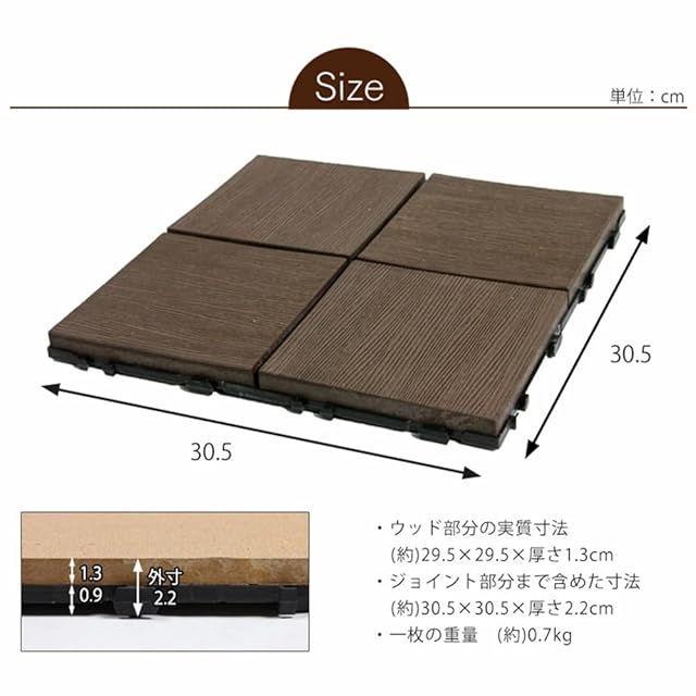 【1枚あたりのサイズ】本体部分の実質寸法:(約)29.5cm×29.5cm×厚さ約1.3cm/ジョイント部分まで含めた全寸法: (約)30.5cm×30.5cm×厚さ約2.2cm