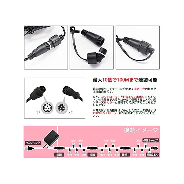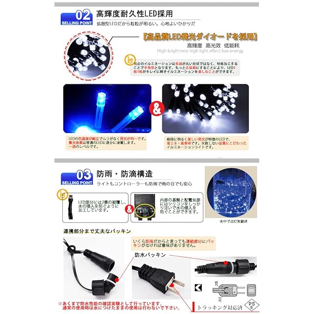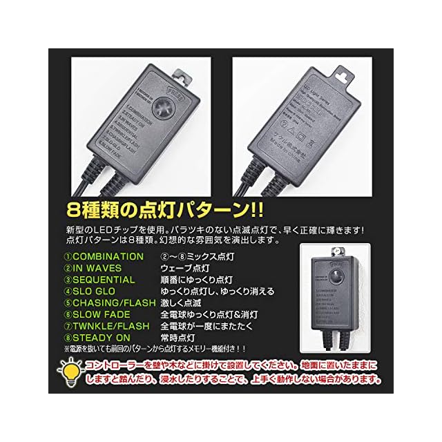 【電気安全法PSE適合品(経済産業省に事業届出提出済み)正規メーカー品】イルミネーションライト定番商品 LED数100球 長さ10m 線径1.8mm 連結コネクター付 1000球まで連結可能。8つの点灯パターン メモリー記憶付き(コンセント抜いても再度差込むと同じ点灯パターンになるので再設定の手間がかかりません。)