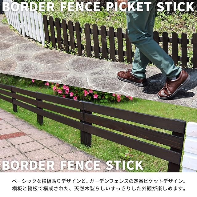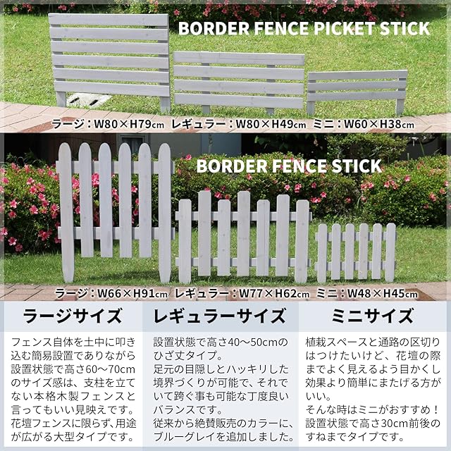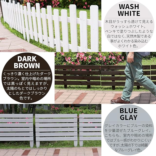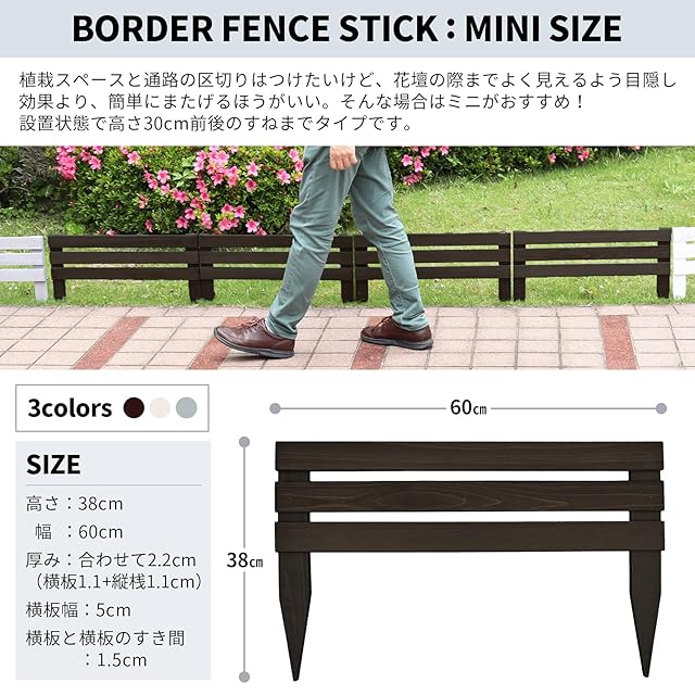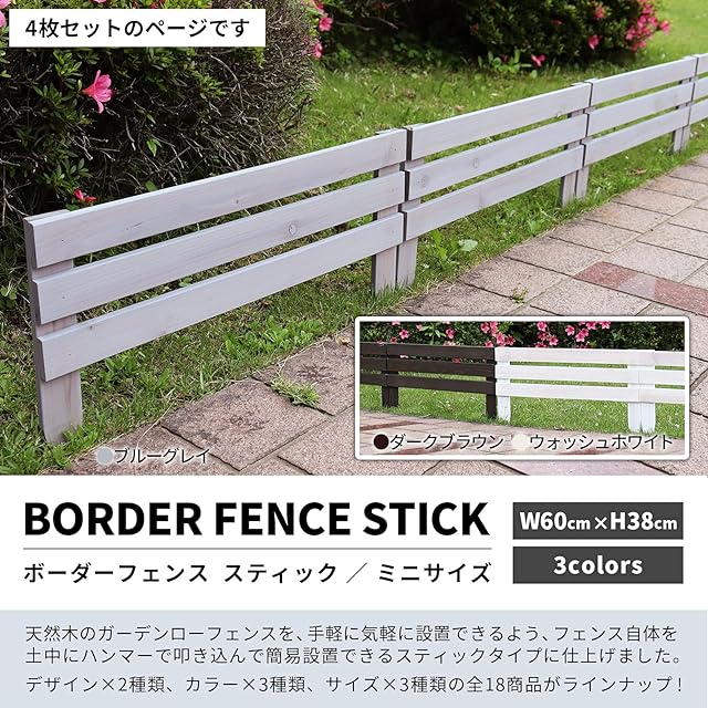 木の温もりが嬉しいガーデンミニフェンス!とってもお手軽なボーダーフェンスです。花壇周りやお庭の通路脇など、土に挿すだけでちょっとモダンなエッジングが楽しめます。カラーはダークブラウンとウォッシュホワイト、ブルーグレイの3種類、サイズはミニサイズ、レギュラーサイズ、ラージサイズをご用意。それぞれ1枚単品と4枚セットがございます。[色/カラー/サイズ]メニューよりお選びください。