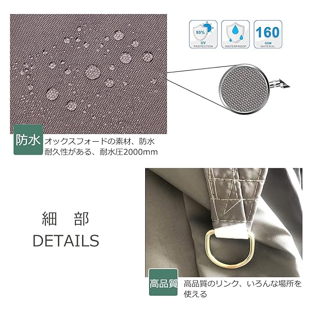 【撥水性】良質な300Dポリエステルで作られ、高いUVカット率、強い防風性、抜群の撥水性などのメリットがあります! 【細部】錆びないステンレス製リング/補強された結び/300Dォックスフォード生地/より強い撥水性と遮熱効果 改良された300Dオックスフォード素材は、柔らかく、柔軟性があり、カビや汚れなどがついてにくい、従来の素材に比べて通気性、 撥水性、遮光性に優れています。高品質のステンレス素材、頑丈で耐久性があり、腐食や錆びがありません。