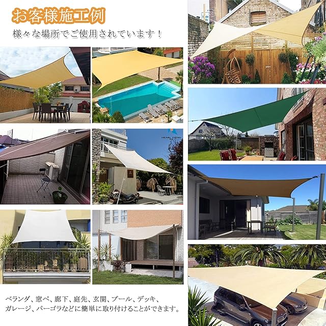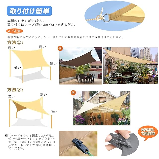 ☀☂【取り付け簡単】❶日除けの取り付けはロープで縛るだけ。ベランダ、庭、玄関、屋根、プール、デッキ、ガレージ、駐車場、パーゴラ、窓辺、廊下など様々の場所に適用。❷シェードをもっとぴんと張って欲しい時、付属のテントクリップ(4個)とロープを活用してください。