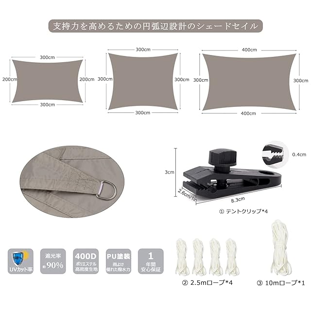 ☀☂【セット内容】 日除け シェード*1、ひも(約2.5m)*4、テントクリップ*4、ひも(約10m)*1、取扱説明書(日本語) *1
