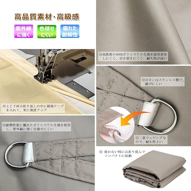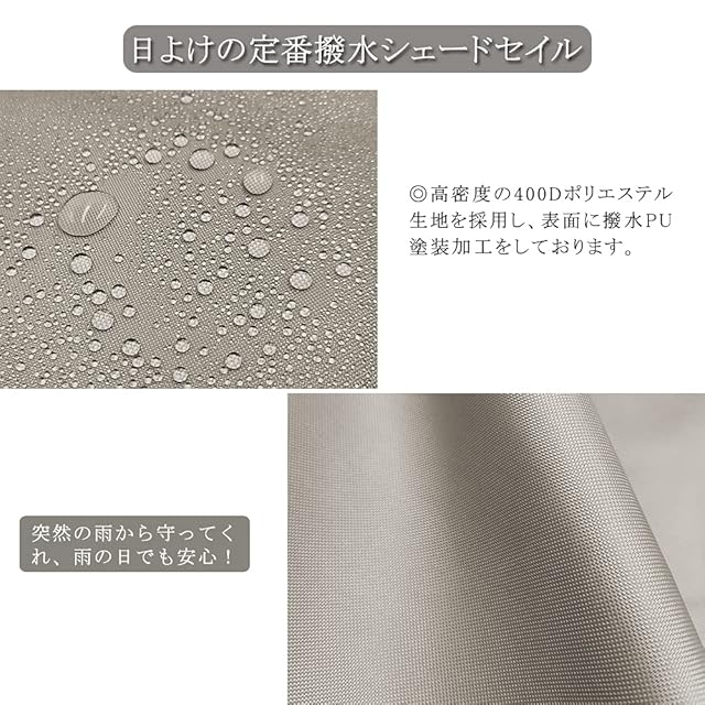 ☀☂【優れた撥水力・雨よけ シェード】日除けの定番防水サンシェード。表面にPUコーティングを加工し、撥水レベル4級、優れた防水効果があり、突然の雨でも安心!
