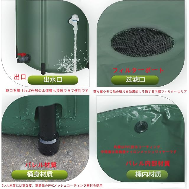 メッシュカバーのデザイン:このレインバレルは、簡単に保管および持ち運びできるように折りたたむことができます。さらに、その緑の表面はあなたの裏庭の光景に適しています。トップメッシュカバーは動物やがれきの侵入を防ぐために新しく設計されており、簡単に取り外し・分解が可能です。開口部が広く、タンク内部に直接手が届きやすいため、定期的な清掃やメンテナンスも手軽に行えます。砂や汚れ、藻類の除去も簡単で、常に清潔な状態を保つことができます。