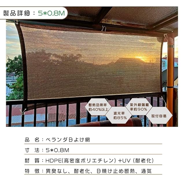 【製品仕様】ベランダ 目隠し シェードのサイズ:横500cm*縦80cm。材質:220gの高密度ポリエチレン(HDPE)。カラー:ブラウン 。付属品:結束バンド*30本、固定用ロープ2本。もし、届いたベランダシェードに破損・汚れなど不良現象がございましたら、お気軽に弊社にご連絡ください。「お問い合わせ案内:製品ページ>販売元>質問する」