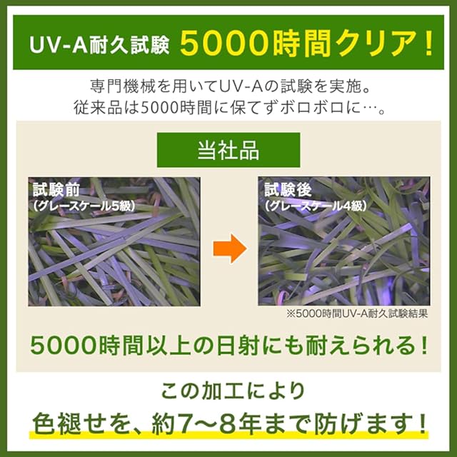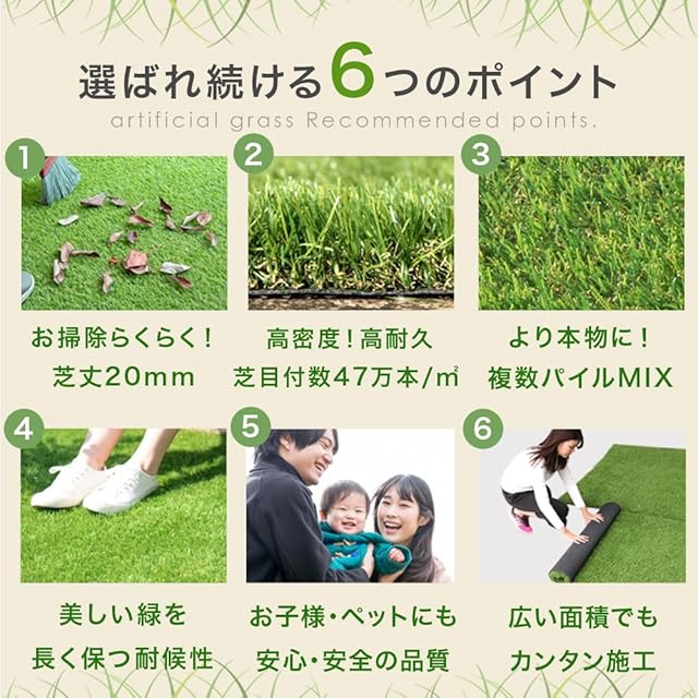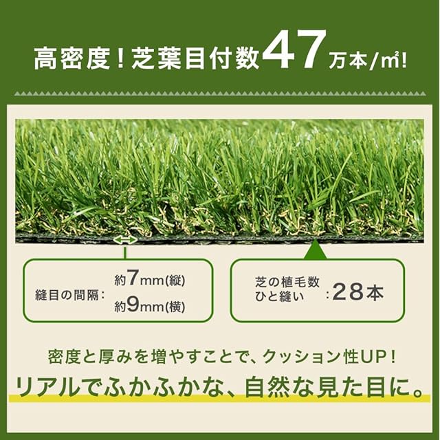 【素材】芝:ポリエチレン、芝葉形 :C型、ポリプロピレン 土台:ポリプロピレン、ラテックス 芝葉目付数(密度)/47万本m2