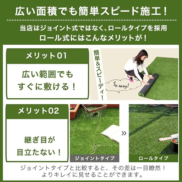 ・2023年9月19日より、ナチュラルグリーンと夏色の販売を開始しました。※生産時期によりわずかに色味に差異がございます。そのため並べてご使用される場合は一度に必要分をご購入いただくようオススメしております。※追加購入をご検討のお客様で、以前ご購入いただいたものがご不明な場合はお気軽にお問い合わせください。※生産時、大きめにカットしているため、奥行に最大10cm程度のばらつきがある場合がございます。※コンクリートに設置する場合は、専用の両面テープや接着剤での固定を行ってください。【人工芝の汚れの対処方法】汚れが気になったら、水洗い・モップでのこすり、掃除機でのごみの除去等でご対応ください。