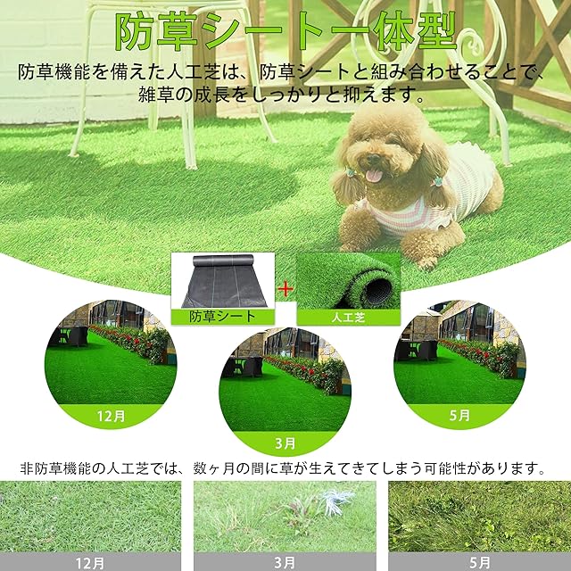 まるで天然芝のような美しさ:人工芝(0.5m×5m・約3.5kg)は、自然な見た目と快適な踏み心地を再現する高密度の4層構造を採用。芝の表面はつや消し加工で、テカリを抑えつつ美しい質感を実現。UVカット機能付きで、日差しによる退色を防ぎ、屋外でも長期間美しさを保ちます。さらに、低ホルムアルデヒド素材を使用しており、小さなお子様やペットがいるご家庭にも配慮した設計です。