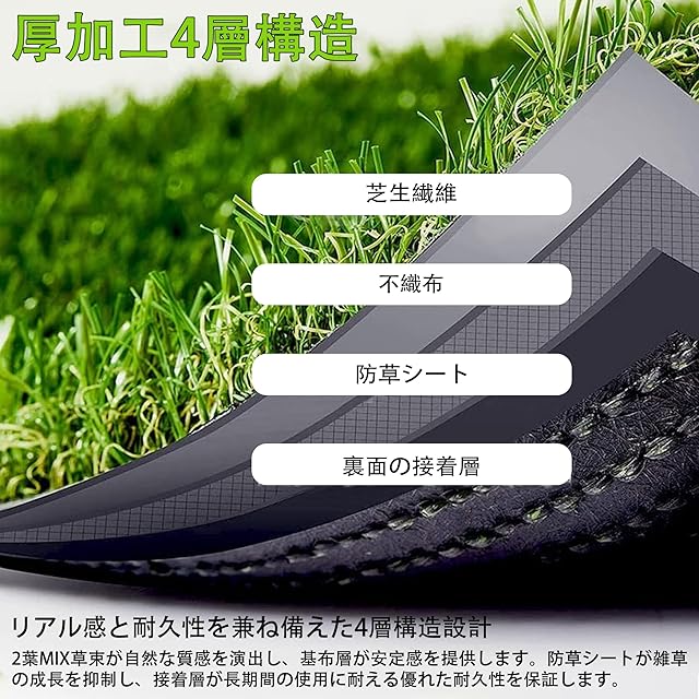 雑草を抑える高機能構造:本芝生は、防草シート層を含む独自の四層構造を採用。一般的な三層構造とは異なり、より高い防草性と安定性を実現しています。裏面には専用の粘着層を施し、芝糸をしっかりと固定することで、使用中の抜け落ちを防止。さらに、99.51%以上の遮光率により、雑草の光合成を妨げて発芽と成長を効果的に抑えます、お庭やベランダを清潔で美しい状態に保てます。