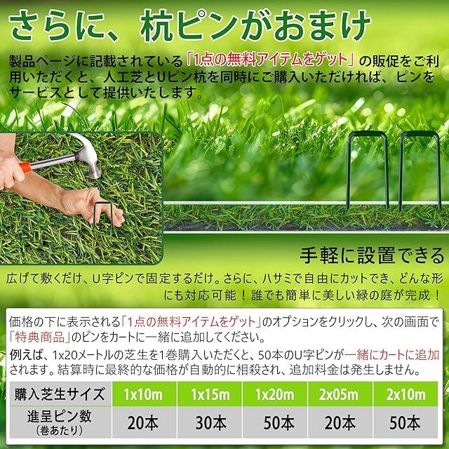 まるで天然芝のような美しさ:人工芝(0.5m×10m・約7kg)は、自然な見た目と快適な踏み心地を再現する高密度の4層構造を採用。芝の表面はつや消し加工で、テカリを抑えつつ自然な質感を再現。UVカット機能付きで、日差しによる色あせも軽減。今なら「1点の無料アイテムをゲット」特典で、U字ピン20本が実質0円に!人工芝と一緒にカートに入れるだけで自動的に割引が適用され、お得です。