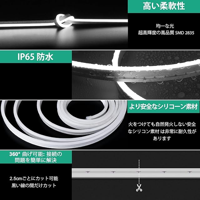 防水性と耐久性— P65防水等級のLEDテープで、プールや雨の日でも安心して使用可能。耐熱性のあるシリコン素材を使用しており、LEDも長寿命で劣化しにくい設計です。注意: 電源アダプターは防水ではありません。屋外で使用する場合は、水に触れないように注意してください。