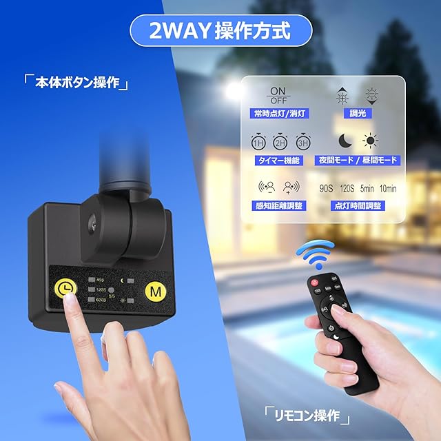 ➤◆【常時点灯モード&1H/2H/3Hタイマー機能&便利なリモコン操作】常時点灯モードとは投光器のように連続点灯することができます。このセンサーライトのリモコンのON/OFFボタンを押して、常時点灯/常時消灯の状態を切り替えできます。常時点灯モードはBBQや作業や夜間スポーツ練習用として等常に明かりを照らしたい幅広いシーンに適用します。リモコンで1H/2H/3Hのタイマー機能を設定すると、1H/2H/3Hの常時点灯後、45秒の夜間センサ―ライトモードに戻ります。常に明かりのニーズに応えるとともに、ライトを消し忘れによる無駄な電気代を節約できます。便利なリモコン操作ができるセンサ―ライトで、遠くから点灯時間や明るさや稼働モードなどを変えられます。リモコンなし製品は設置場所によっては1度設置すると調整が面倒ですが、リモコンがあれば、高いところに便利に操作するだけでなく、細かい設定も調整することができいます。