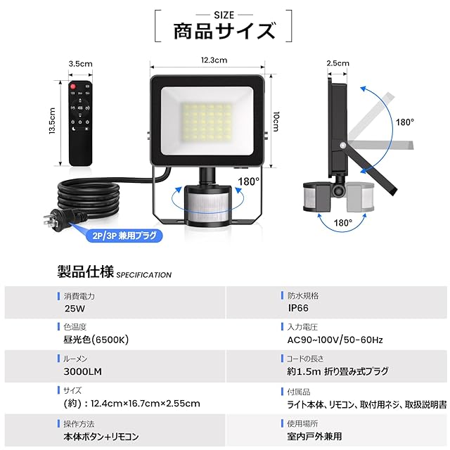 ➤◆【製品の仕様】製品の仕様:➀消費電力:25W➁LEDの色:昼光色➂人感センサーモード/常時点灯モード➃点灯時間+検知距離+稼働モード+明るさ調整可能➄配光角:120°➅防水レベル:IP66防水仕様➆1H/2H/3Hタイマー機能➇サイズ:(約):12.4cm×16.7cm×2.55cm➈操作方法:リモコン操作/本体ボタン操作(2way)➉使用用途:玄関、倉庫、アプローチ、駐車場、軒下、ベランダ、階段、地下室、側道、裏側など屋外のあらゆる場所にご使用頂けます。防犯や照明などにも役に立ちます。夜でも明るくなり、防犯性が高まったと感じますので、暗い方にはお勧めします。センサーライトには監視カメラも合わせて取り付けてもいいです。真夜中でも画面までハッキリと記録が出来ます。また、センサ―ライトは車に反応して点灯するので車庫入れがしやすくなり、ベランダや庭で夜に洗濯物を取り込むときにも便利です。ライトアップ目的なら玄関前の植え込みやテラスに設置すると、不審者が近づきにくい雰囲気にもなります。