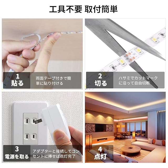 【自由切断可・取付簡単】テープライト自体が柔軟性がある強力両面テープなので、自由に曲がれて好きな形に成りやすくて取り付け簡単です。場所や用途に合わせて、1ユニット(LED6個)単位で自由にカット可能、素人でも楽にできます。ledテープを剥がしても痕がつかない、賃貸の方にもおススメ! ※(ご注意:カットライン以外を切断すると、不点灯となります。残った部分は2ピンの2835コネクタで接続できます。)