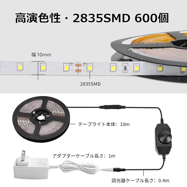 【高演色性・間接照明】10mのLEDテープ基板に、高演色2835SMDチップを600個も使っており、明るく、鮮やかな電球色再現が可能なテープLEDです。店舗、住宅の間接照明や什器照明に使えて、高級感ある広い空間を演出することができます。