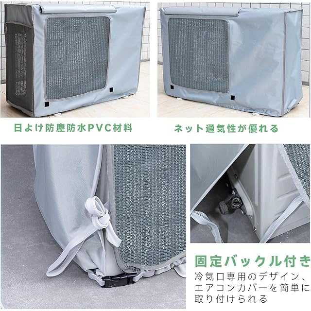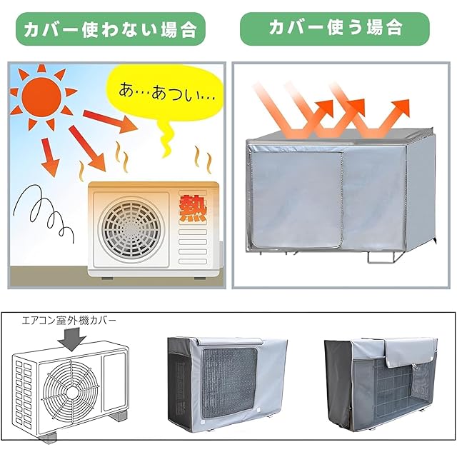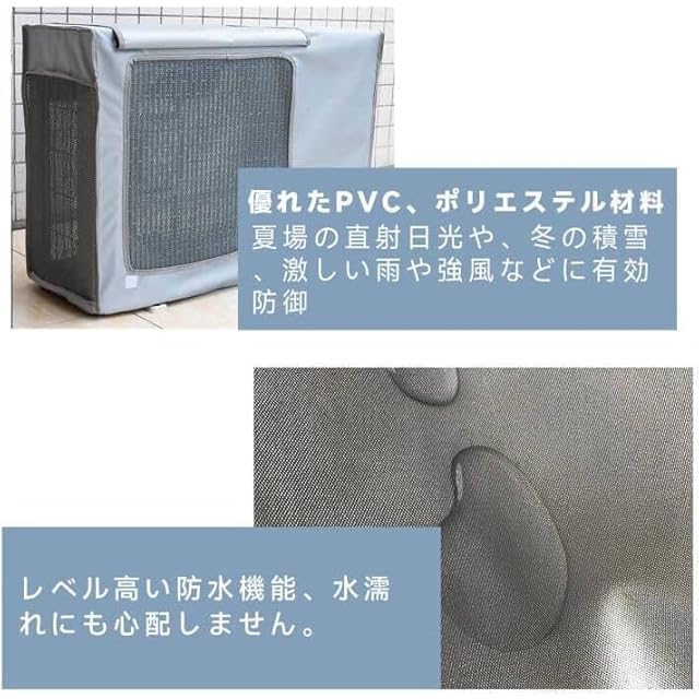 【過酷な環境から守る】このエアコン室外機遮熱カバーは撥水加工生地を採用しているので、雨水を撥ね付け、泥やホコリなどがこびりつくのを防止できます。直射日光、雨、雪などの過酷な環境から室外機を守ってくれ♪雨天でも快適に過ごせます。耐候性に優れているので、オールシーズンOK!台風や、梅雨などの雨の季節には飛散した泥水や葉が室外機中に入り込むのを防ぎます。