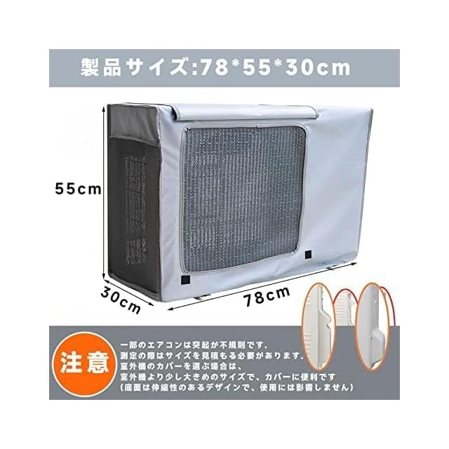 【エアコン室外機カバー】製品仕様:寸法78*55*30cm。 室外機は長時間さらされるため、夏の直射日光、冬の降雪、大雨、強風などの悪天候により、冷房効果や耐用年数に影響を与える可能性があります。 エアコンの屋外フードは防水生地と完璧なメッシュデザインで作られており、エアコンの冷却効率を維持し、その耐用年数を延ばすための強力な保護を提供します。