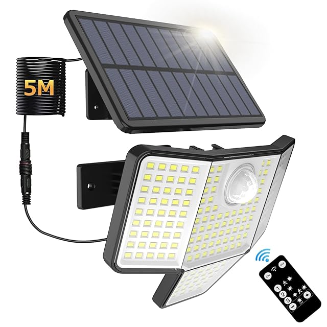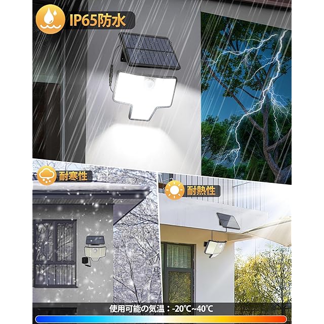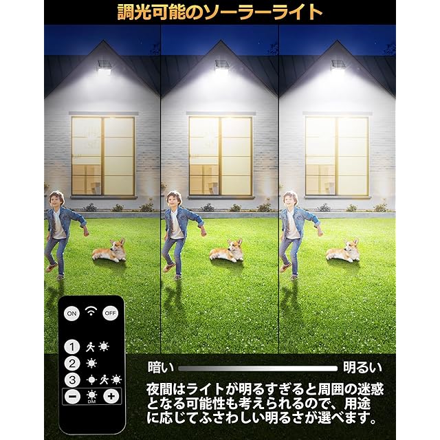 【新世代センサーライト・明るさ調節】本製品は、今までの常識を覆し、明るさ調節可能、四面に同時照射可能、より高輝度照明を継続していただくために開発された、最新世代のソーラーライトです。リモコンのボタンを押すだけで明るさが三段階調整可能で、利便性が高いです。弊店の最新版だけでなく、市場ではLEDソーラーライトシリーズで機能と性能が最新分離型ledセンサーライトです。
