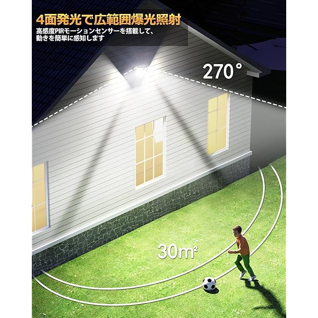 【189LED・四面発光・270°照明】この人感センサーライトは高輝度の189個LEDを採用し、効率的で、照明効果に優れて、超明るく点灯できます。センサーライトは革新的な4面ライトパネルデザインを採用して、四面が同時照射可能です。伝統的のガーデンライトより、照明の範囲もより広いになります。玄関、庭、廊下、物置、ガレージ、ガーデン、縁側、駐車場など場合で防犯や照明に最適です。