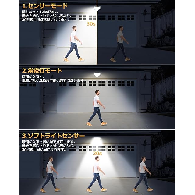 【3つの知能センサーモード・リモコン操作】昼間と明るい場所では点灯しません。リモコンのボタンを押すだけで3つのモードを設定できます。✅モード1: 闇になっても点灯なし。動きを感じされると強い光になり、30秒後、消灯状態になります。✅モード2: 暗闇に入ると、電量がなくなるまで弱い光で点灯します。✅モード3: 闇に入ると弱い光で点灯します。動きを感じされると強い光になり、30秒後、弱い光に戻ります。