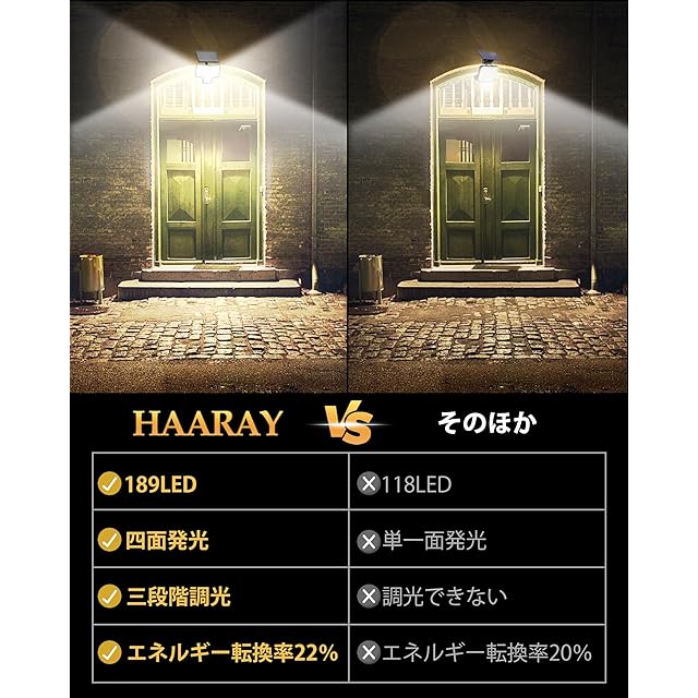 HAARAY ソーラーライト 屋外 センサーライト ソーラー【4面発光 3段階調光 3つ知能モード】高輝度 人感センサー 自動点灯/消灯 太陽光発電 IP65防水 壁掛け式 ガーデンライト 駐車場/玄関/廊下/庭先/停電時適用 日本語説明書付き | つむぎ屋