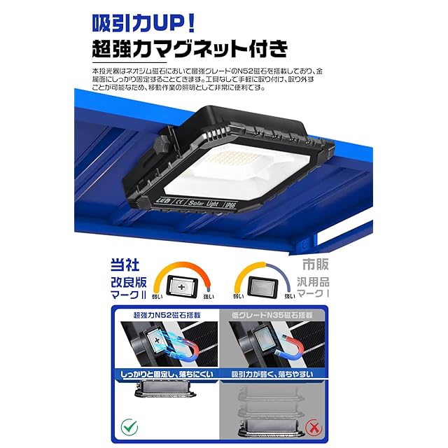 【最強クラスN52磁石採用|金属面に強力固定&工具不要】 従来のN35磁石に比べて、吸着力が大幅にアップしたN52ネオジム磁石を搭載。車のボディ・倉庫の棚・工事用金属板など、あらゆる金属面にがっちり固定。工具なしで着脱可能なので、持ち運びもラクラク!