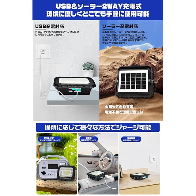 【USB&ソーラーの2WAY充電対応|アウトドアや非常時でも安心】 高効率ソーラーパネル搭載により、太陽光を電力にしっかり変換。電源がない環境でも自動充電可能で、災害時・停電時・登山・キャンプなどあらゆる場面に対応。さらに、付属のType-Cケーブルを使えば家庭用電源やモバイルバッテリーからも簡単に充電可能。