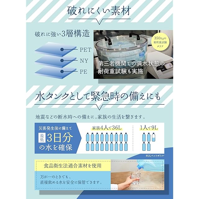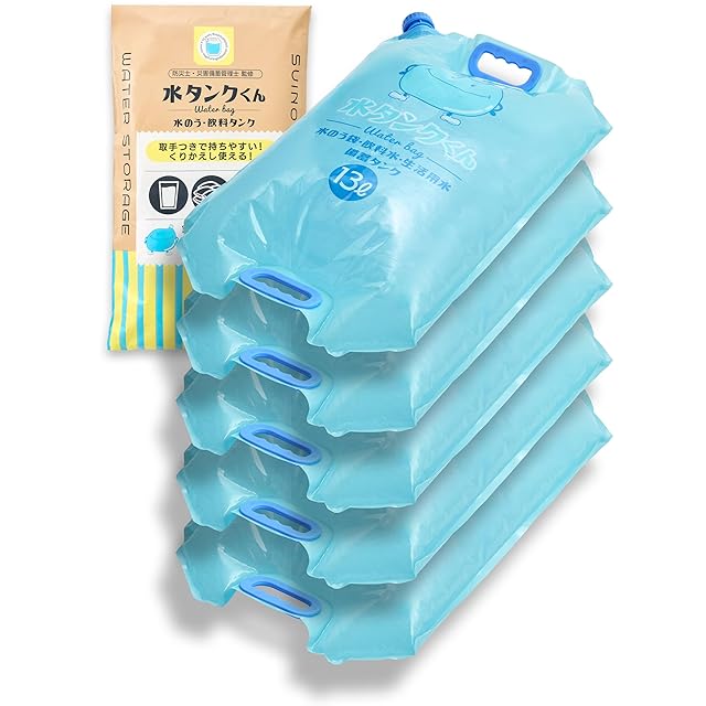 【食品衛生法試験 合格】 食品にも使える安心素材。防災備蓄の給水袋として最適です。 13L × 5枚入りだから、家族4人の生活用水(約3日分)に対応できます。