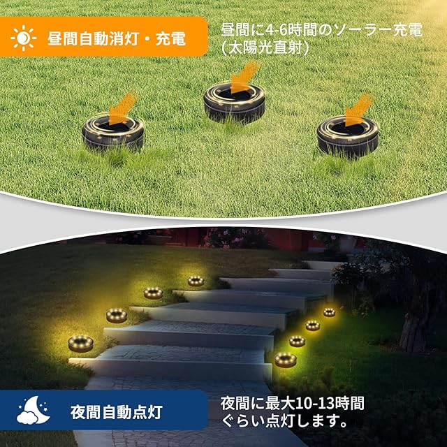 【簡単設置・多用途なソーラーライト!】埋め込み式ソーラーライトは、庭/玄関/キャンプ/駐車場/庭園/池/歩道など、さまざまな場所で使用可能です。温かい雰囲気を演出でき、近隣に迷惑をかけず、防犯にも最適です。電源や配線不要で、設置が非常に簡単。お好みの形に自由に配置できます。お庭の装飾に最適なガーデンライト。