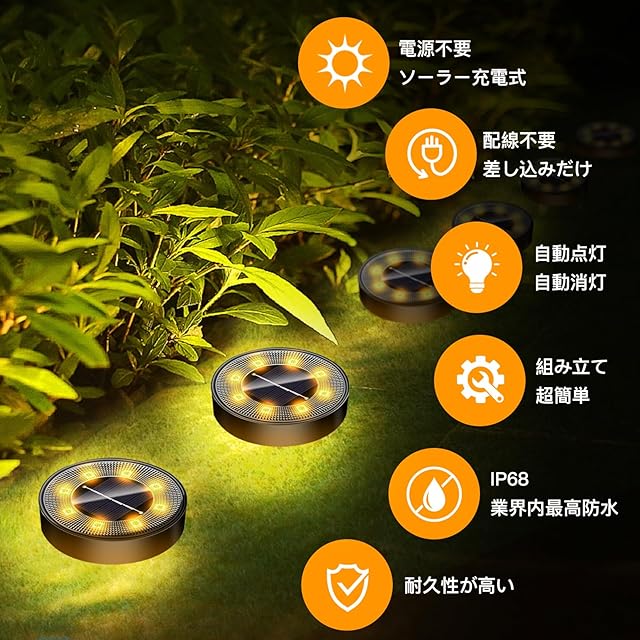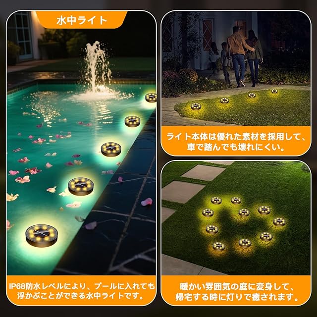 ソーラーライト 屋外 IP68防水 埋め込み式 水中ライト ガーデンライト おしゃれ ソーラー 自動点灯 光センサー 太陽光パネル充電 庭/玄関先/芝生/車場/歩道 設置簡単 防災対策 防犯ライト 置き型 電球色 高輝度 LED (4) | つむぎ屋
