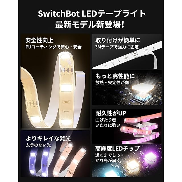 【SwitchBot LEDテープライト新モデルがついに登場】PUコーティングでしっかり保護され安全。3Mテープのシールを剥がして貼り付けるだけで、強力に固定されます。放熱性と安定性も向上し、耐久性にも優れています。よりキレイに発光する高輝度LEDチップを使用し、これまで以上に明るく長くご使用いただけます。