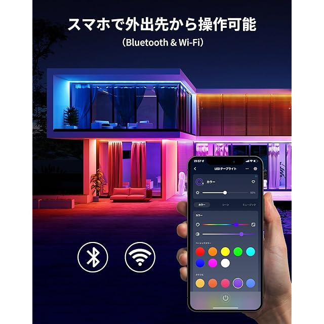 【外出先から遠隔操作したり、スケジュール機能で自動化が可能 】ハブ不要でWi-Fi(2.4GHz)に接続し、遠隔およびオートメーション操作が可能です。Wi-Fiが不安定な時は自動でBluetoothへ切り替られます。防犯対策にもお役立ち!また、アプリでスケジュールを設定しておけば、毎日決まった時間にLEDテープライトを点灯させることができます。