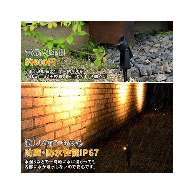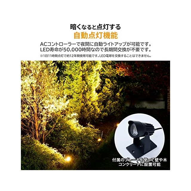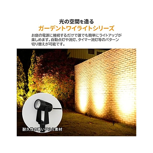 【特徴】壁や木を優しく照らすガーデンライトです。スタートキット(ライト本体・キャップ・ACコントローラー・プレート他)で必要なものは全て揃っているので、届いたらすぐにご使用いただけます。ダウンビームレンズ付属で足元を優しく照らします。付属のACコントローラーで夜間の自動ライトアップや自動点灯・消灯、タイマー消灯などのパターンの切り替えが行えます。アンカーを使って土や芝生への設置や、付属のプレートを使えば壁や木にもライトの設置が出来ます。IP67の防塵防水性能なので雨が降っても問題なくご使用いただけます(屋外用PSE認証取得済み)。ライトは耐久性の高いアルミ素材を採用し、LED寿命は約50,000時間と長期交換が不要なので、お手入れも簡単です。お庭の壁を明るく照らしたり、木や植物などのシルエットを楽しんだりと、使い方は様々です。誰でも簡単にお庭のライトアップを楽しめます。