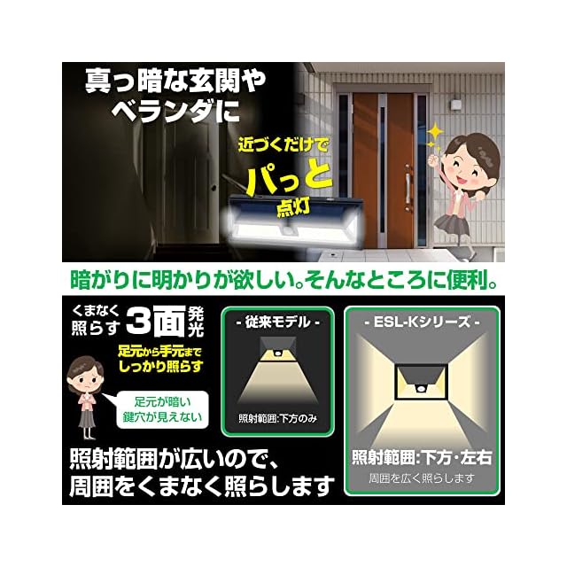 ■電源:ニッケル水素充電池3.6V600mAh ※充電池の交換はできません ■点灯保持時間:約10秒(固定) ■点灯開始照度:約10lx以下 ■保護等級:IPX4(防沫形) ■光源:白色LED※LEDの交換はできません。 ■全光束(満充電時):点灯時約100lm ■使用周囲温度範囲:-20℃〜+50℃ ※電池の特性上、周辺温度が低い場合は、電池の性能が十分に発揮できない場合があります。 ■使用日数:センサーモード約77日※使用条件により使用日数は短くなる場合があります。 ※1日10回点灯時※満充電時