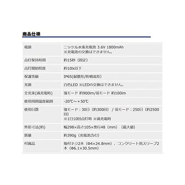【商品詳細】・サイズ:幅106×高さ121×奥行96(mm)(最大値)・質量:約304g(充電池含む)・電源:ニッケル水素充電池 3.6V 800mAh ※充電池の交換はできません。・付属品:取付ネジ2本(φ4×25mm)、コンクリート用スリーブ2本(φ5.8×23.6mm) ・点灯保持時間:約13秒(固定) ・点灯開始照度:約4lx ・保護等級:IP65(耐塵形/防噴流形)