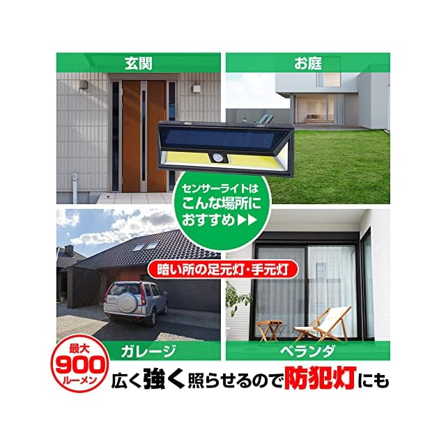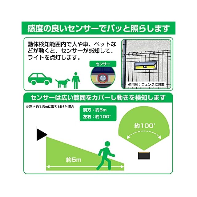 【広範囲に周囲を照らす】検知範囲は広範囲な前方約5m、左右約100°。周囲が暗くなると自動で点灯する常夜灯モード搭載(ON/OFF切替可能)です。