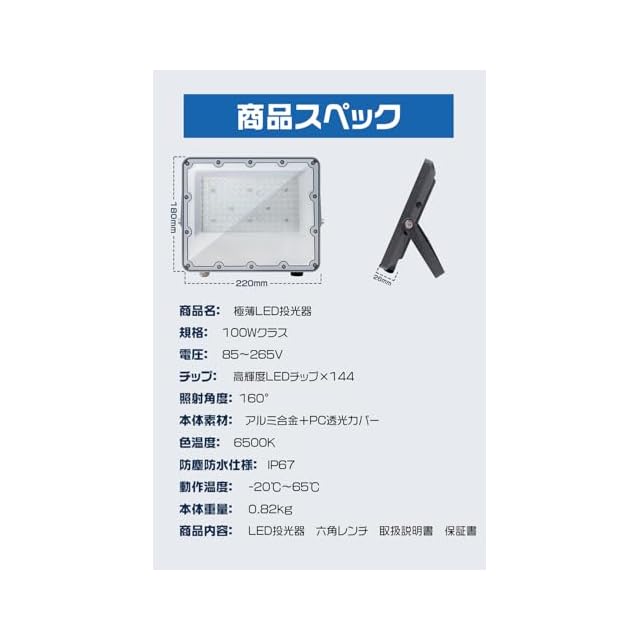 極薄LED投光器100Wクラス ●色温度:6500K(昼光色) ●対応性:85〜265V●本体重量:約0.82KG