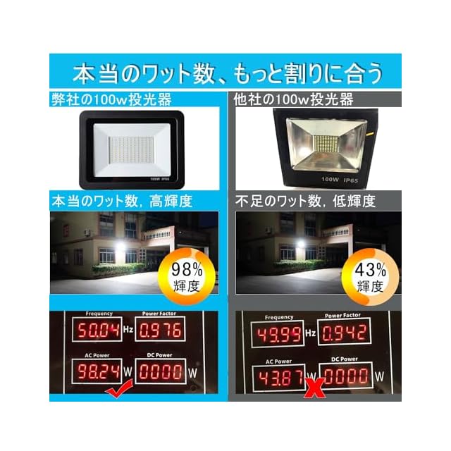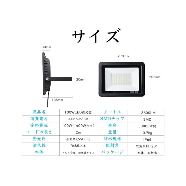 【LED投光器 100W規格】:144個高輝度SMDチップを採用、発光効率は非常に高い、極薄型100W LED投光器1400Wに相当、普通のLED投光器より明るく、安定しています。接続線:2メートル、 入力電圧:86-265V 、光束:13600ルーメン 、色温度6500K(昼光色)、TVS保護装置内蔵。120°までの発光角度で、長距離&広い放射範囲、今までのLED投光器より広い範囲の光源を提供いたします。