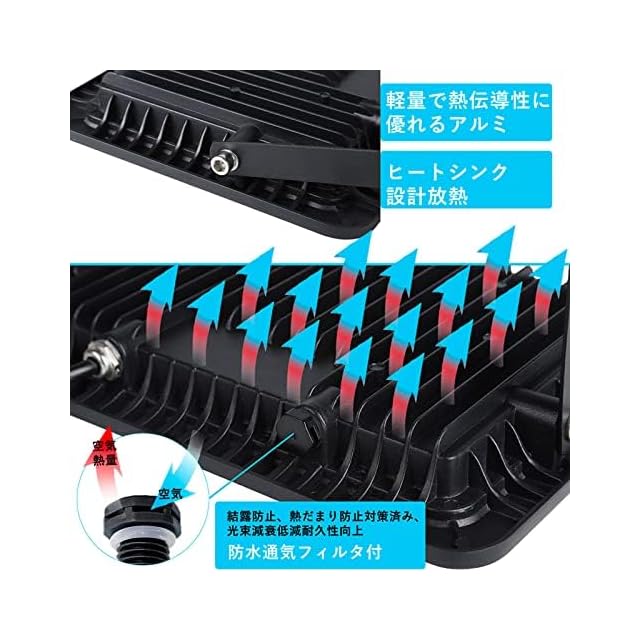 【耐久性】LED投光器は最新型のより厚いアルミ合金製フレームを採用し、錆びなくて、ヒートシンクで空気と物体が触れ合う表面積をどんどん大きくして、熱を逃げやすくしていく、放熱性能を改善しています。98%高透光率の防爆ガラスレンズ採用し、防爆性能が高くて、通光率も上がり、均一な発光が実現。LED投光器の使用寿命を延長しました。